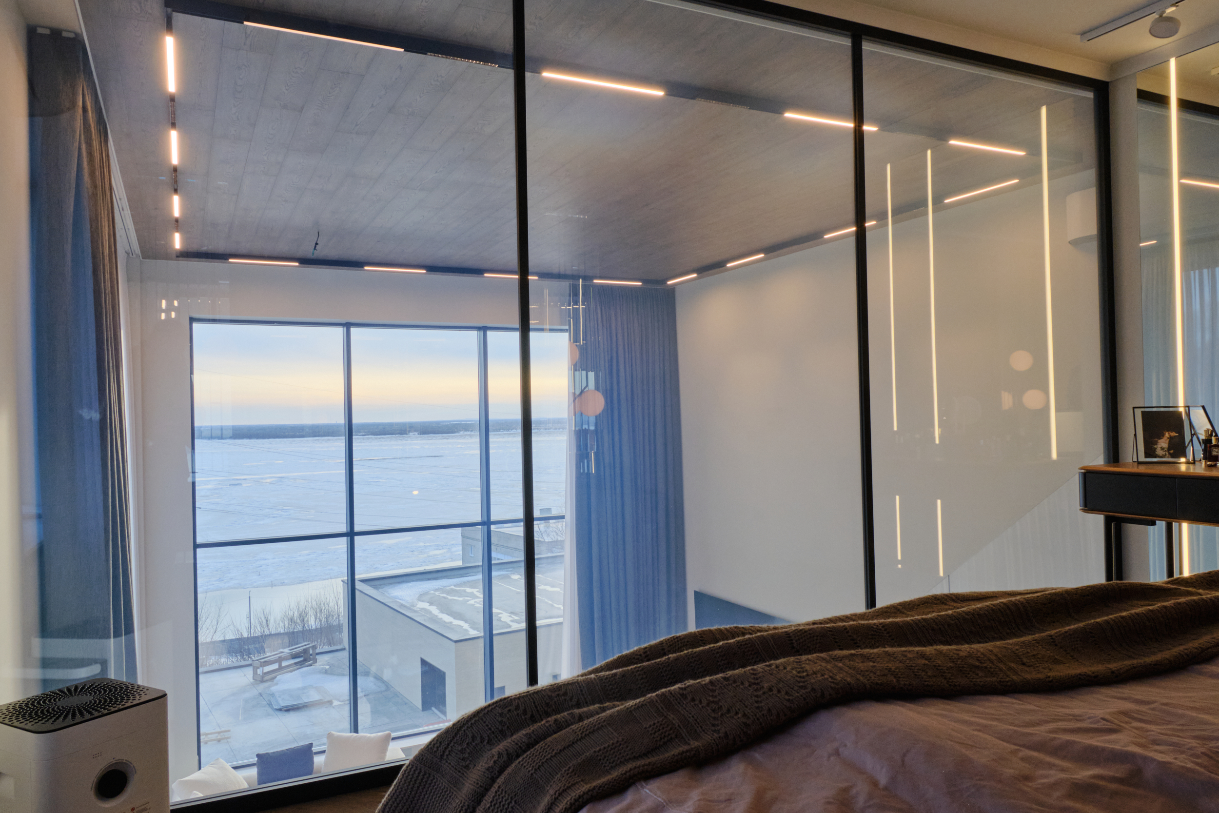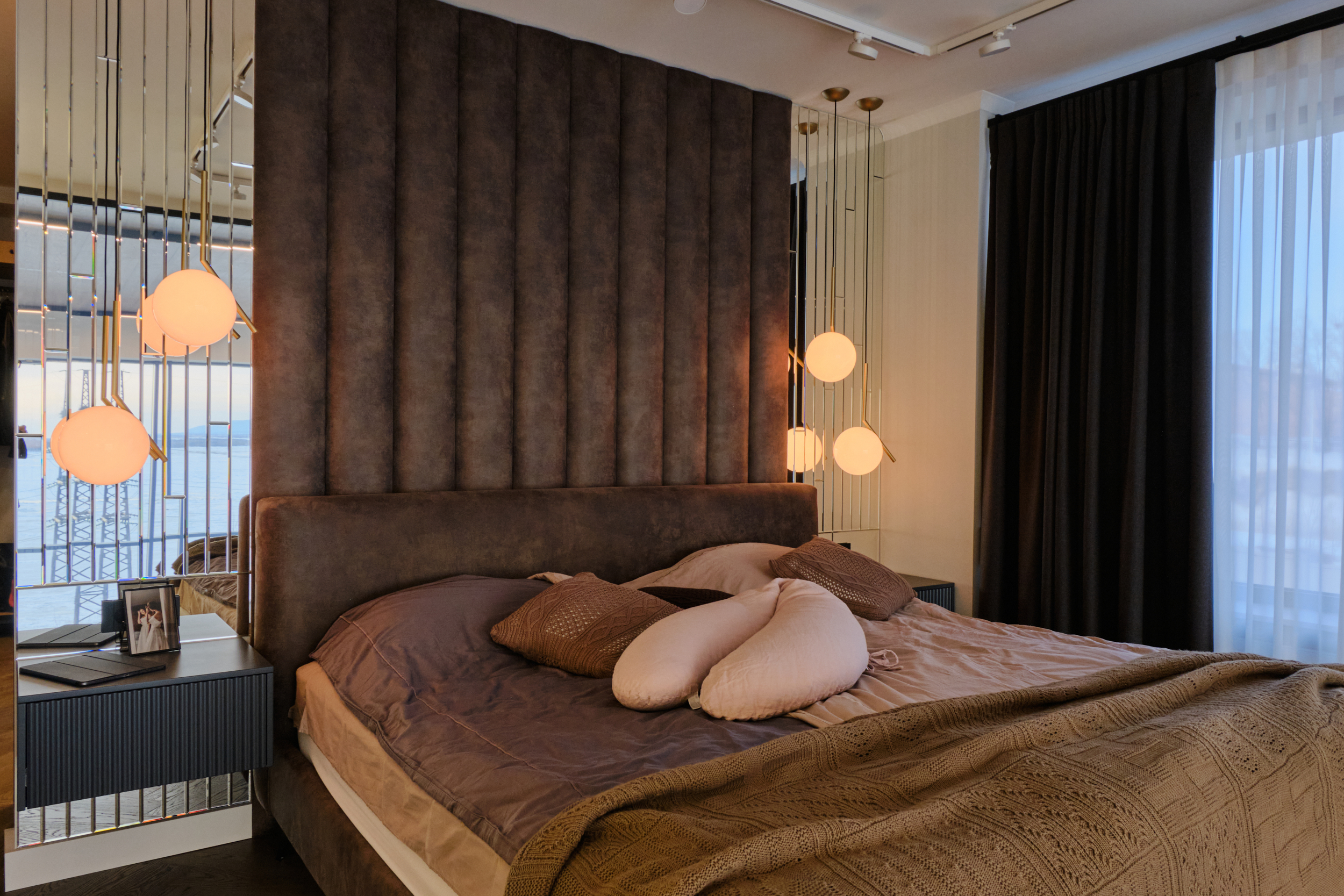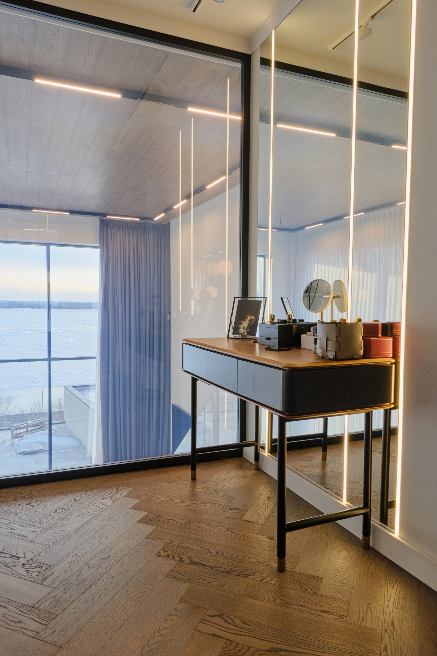 Уникальная двухуровневая квартира, созданная как частный дом в городской многоэтажке. Пространство продумано до мелочей, а панорамные окна открывают завораживающий вид на реку, даря ощущение уединения и свободы. Заказчики — молодая пара, много путешествовавшая, что сформировало у них стремление к эстетике и премиальному комфорту. Этот проект — идеальное сочетание городской динамики и домашнего уюта высокого уровня.